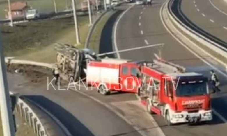 Një automjet shihet të jetë rrokullisur në dalje të autostradës.