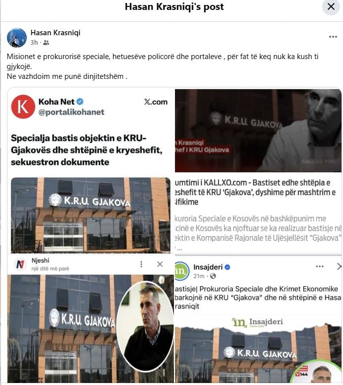 “Misionet e Prokurorisë Speciale, hetuesve policorë dhe portaleve, për fat të keq nuk ka kush t’i gjykojë. Në vazhdim me punë dinjitetshëm”, shkroi Hasan Krasniqi.