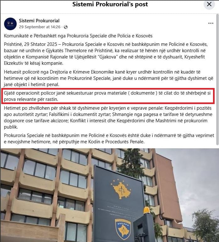 Ndryshe, Prokuroria Speciale bashkë me Policinë e Kosovës, e kanë realizuar urdhrin e Gjykatës Themelore në Prishtinë, ka realizuar një urdhër kontrolli në objektin e Kompanisë Rajonale të Ujësjellësit “Gjakova” dhe në shtëpinë e të dyshuarit, Kryeshefit Ekzekutiv të kësaj kompanie.