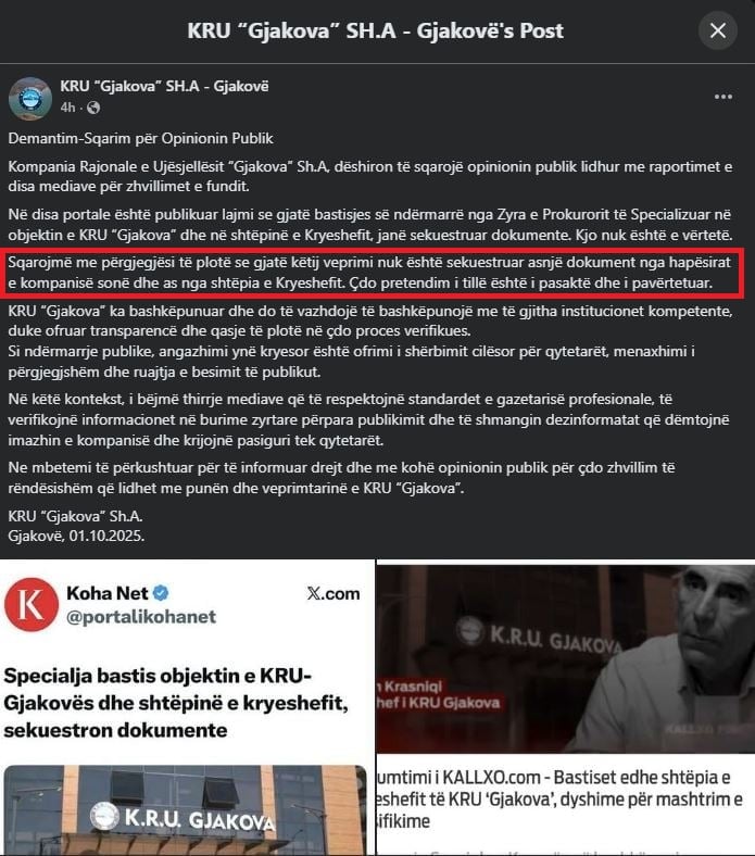 “Në disa portale është publikuar lajmi se gjatë bastisjes së ndërmarrë nga Zyra e Prokurorit të Specializuar në objektin e KRU “Gjakova” dhe në shtëpinë e Kryeshefit, janë sekuestruar dokumente. Kjo nuk është e vërtetë. Sqarojmë me përgjegjësi të plotë se gjatë këtij veprimi nuk është sekuestruar asnjë dokument nga hapësirat e kompanisë sonë dhe as nga shtëpia e Kryeshefit. Çdo pretendim i tillë është i pasaktë dhe i pavërtetuar”, shkruhet në njoftimin e tyre.