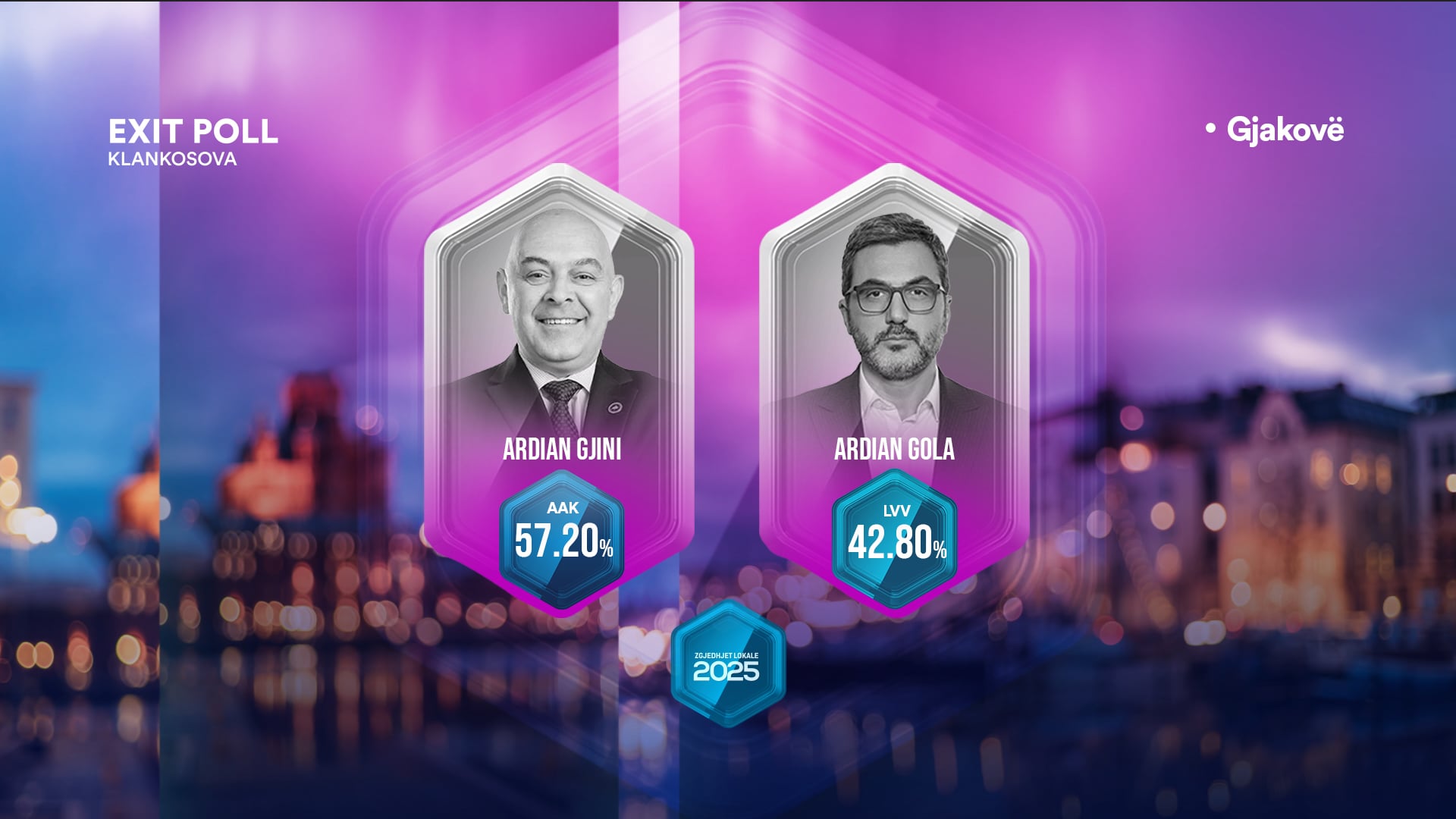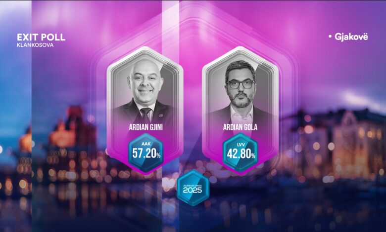 Klan Kosova ka publikuar ekskluzivisht Exit Poll-in për balotazhin në Gjakovë, ku dy emnakët, Ardian Gjini i AAK-së dhe Ardian Gola i VV-së ‘luftuan’ për karrigen e kryetarit.