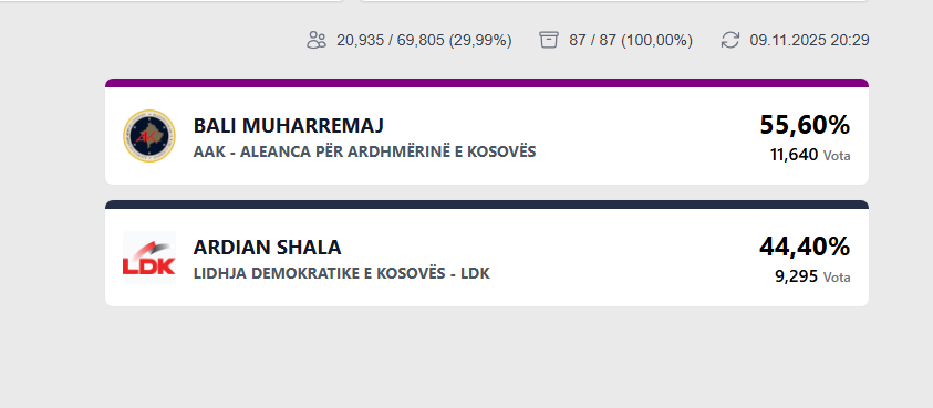 Muharremaj nga AAK ka fituar 11.640 të votave, ndërsa Shala i LDK-së, 9.295 vota.