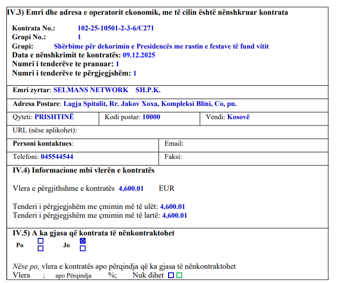 Kontrata e kategorizuar si “Shërbime” iu dha kompanisë “Selmans Network”,
