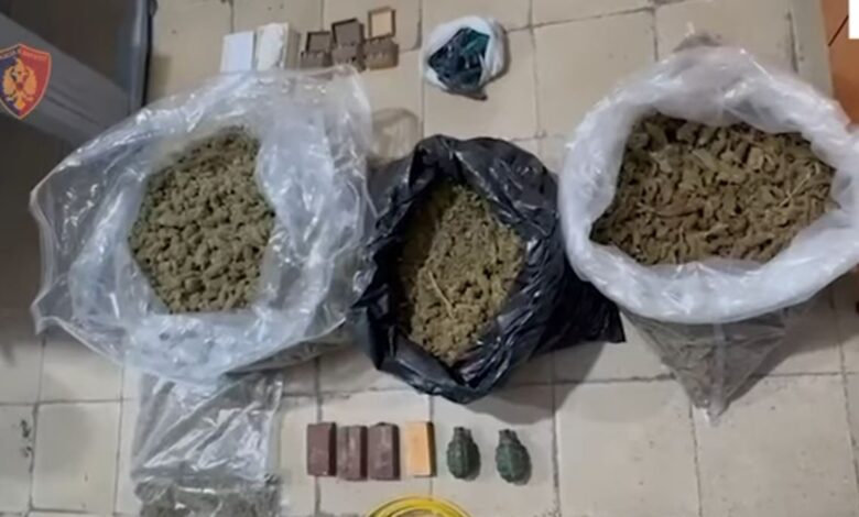 Gjatë kontrollit në banesën e 27-vjeçarit, në Tiranë, u gjetën 1 kg lëndë e dyshuar narkotike kanabis, 1 peshore elektronike, 1 shufër metalike dhe 1 armë e ftohtë (thikë)”.