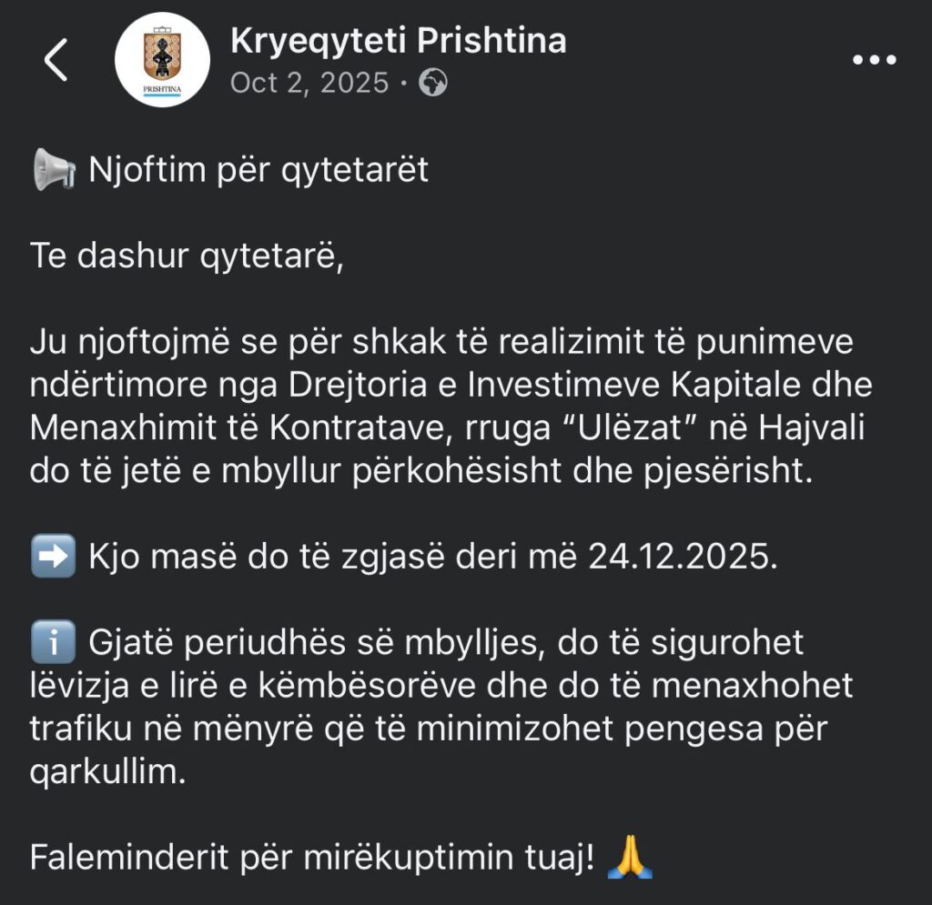 “Njoftim për qytetarë ju njoftojmë se për shkak te realizimit të punimeve ndërtimore nga Drejtoria e Investimeve Kapitale dhe Menaxhimit të Kontratave, rruga “Ulëzat” në Hajvali do të jetë e mbyllur perkohesisht dhe pjesërisht. Kjo mase do te zgjase deri me 24.12.2025”, ishte njoftimi i komunës.