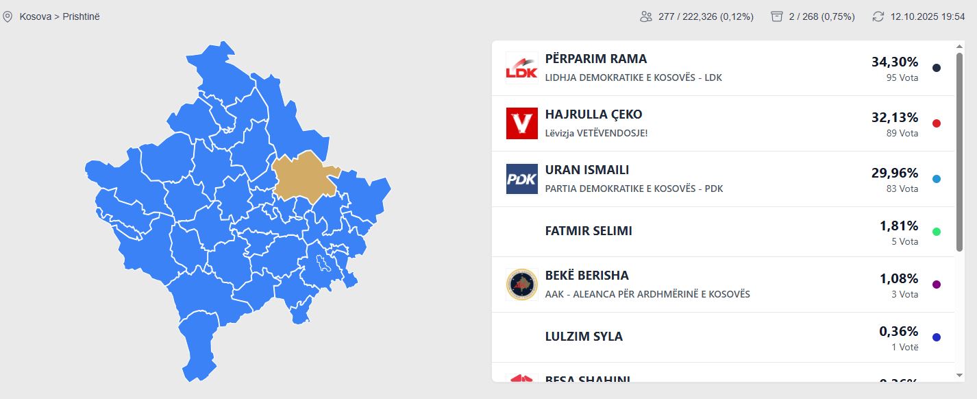 Nga votat e para, sipas KQZ-së prin Përparim Rama i LDK-së me 34.3 për qind, apo 95 vota, kurse i dyti është Hajrulla Çeko i VV-së me 89 vota apo 32.13 për qind.