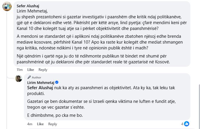 Gazetari Lirim Mehmeaj ka reaguar përmes një komenti kur është pyetur për dokumentarin e transmetuar së fundmi në Kanal 10, me autor Kushtrim Sadikun, duke vënë në pikëpyetje objektivitetin dhe standardet profesionale të trajtimit të konfliktit të fundit mes Izraelit dhe Palestinës.