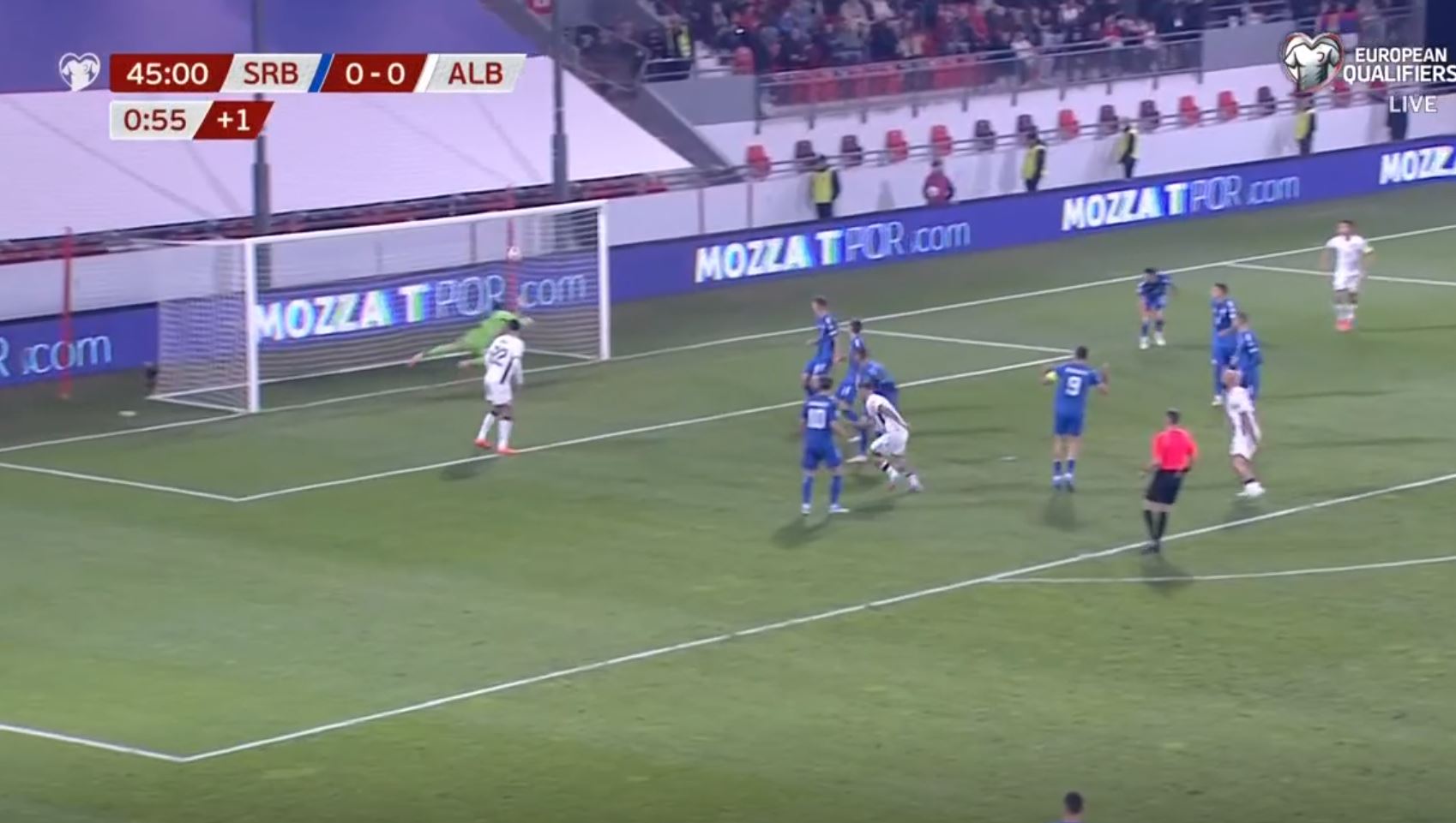 45’ Ka përfunduar pjesa e parë në mes Serbisë dhe Shqipërisë. Gjatë 45 minutave të para nuk u prodhua asnjë rast i mirë shënimi por që në tribuna pati plot thirrje anti-Kosovë nga tifozët serbë që janë të pranishëm në stadium në Leskovc.