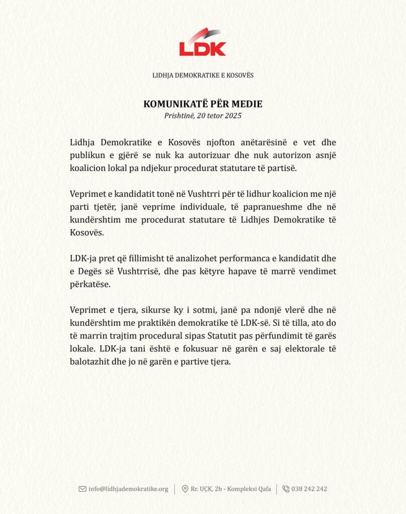 “Lidhja Demokratike e Kosovës njofton anëtarësinë e vet dhe publikun e gjërë se nuk ka autorizuar dhe nuk autorizon asnjë koalicion lokal pa ndjekur procedurat statutare të partisë.Veprimet e kandidatit tonë në Vushtrri për të lidhur koalicion me një parti tjetër, janë veprime individuale, të papranueshme dhe në kundërshtim me procedurat statutare të Lidhjes Demokratike të Kosovës.LDK-ja pret që fillimisht të analizohet performanca e kandidatit dhe e Degës së Vushtrrisë, dhe pas këtyre hapave të marrë vendimet përkatëse.