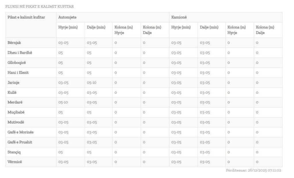 Sipas Qendrës Kombëtare për Menaxhimin Kufitar, pritjet deri në 10 minuta janë regjistruar në pikën kufitare në Merdarë, ndërsa në pikat e tjera kufitare ato variojnë nga 3 deri në 5 minuta.
