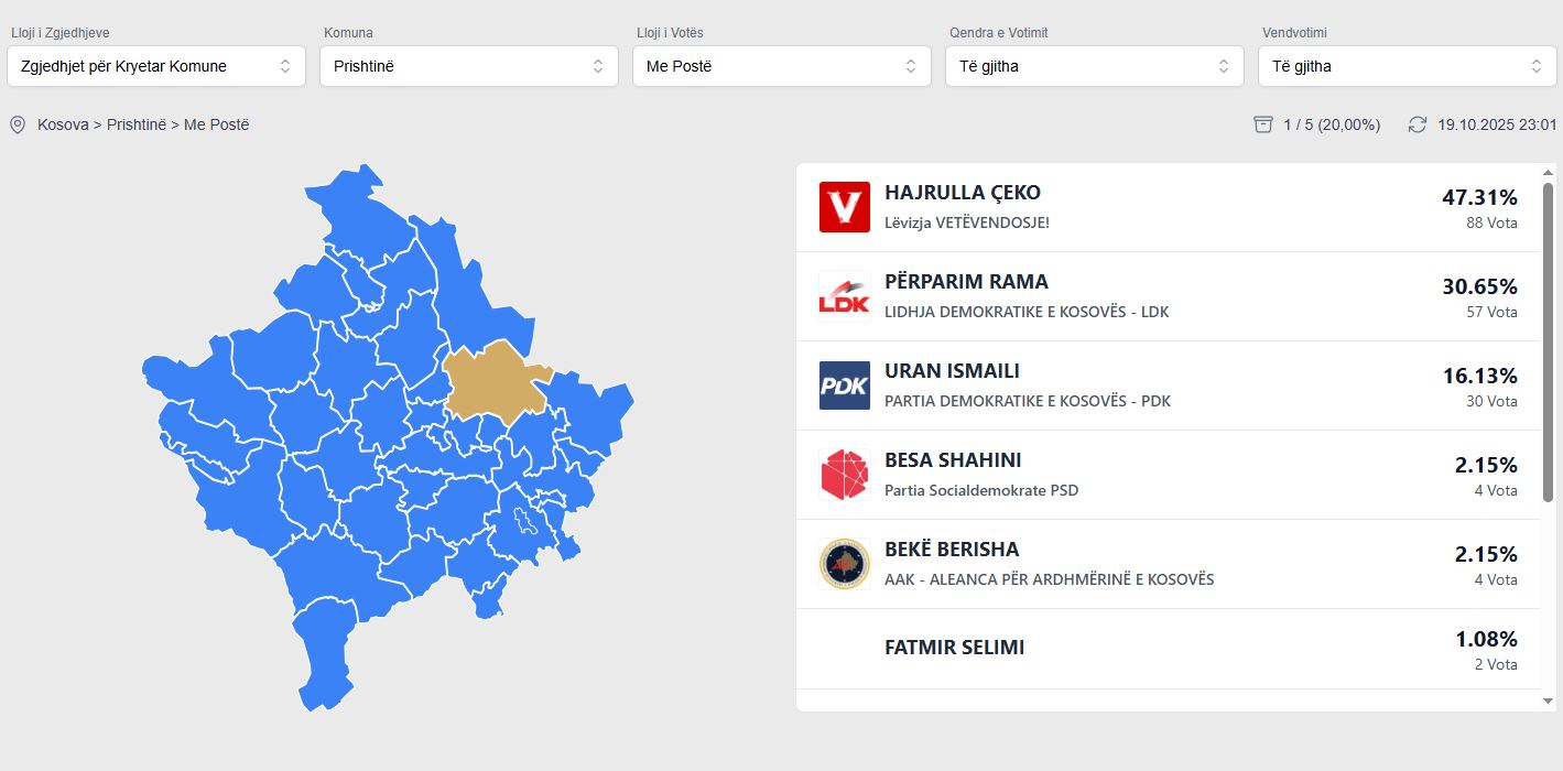 Sipas KQZ-së, në bazë të 20 për qind të votave të numëruara nga diaspora, kandidati i VV-së, Hajrulla Çeko, i ka marrë 47.31 për qind apo 83 vota.