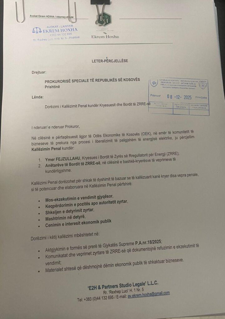 Oda Ekonomike e Kosovës (OEK) ka njoftuar se ka dorëzuar Kallëzim Penal në Prokurorinë Speciale ndaj Kryesuesit dhe anëtarëve të Bordit të Zyrës së Rregullatorit për Energji (ZRrE), për dyshimin e bazuar se ata kanë kryer vepra penale.