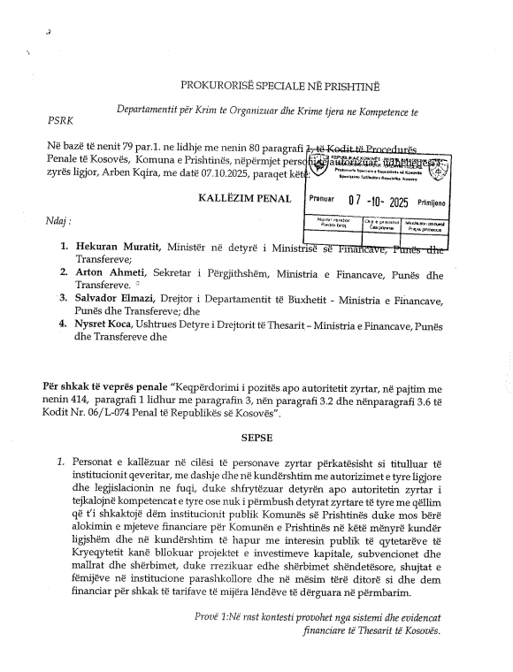 Sipas kallëzuesit, katër zyrtarët dyshohen për keqpërdorim të detyrës zyrtare dhe tejkalim të kompetencave, për shkak të bllokimit të 35 milionë eurove të dedikuara për Komunën e Prishtinës.