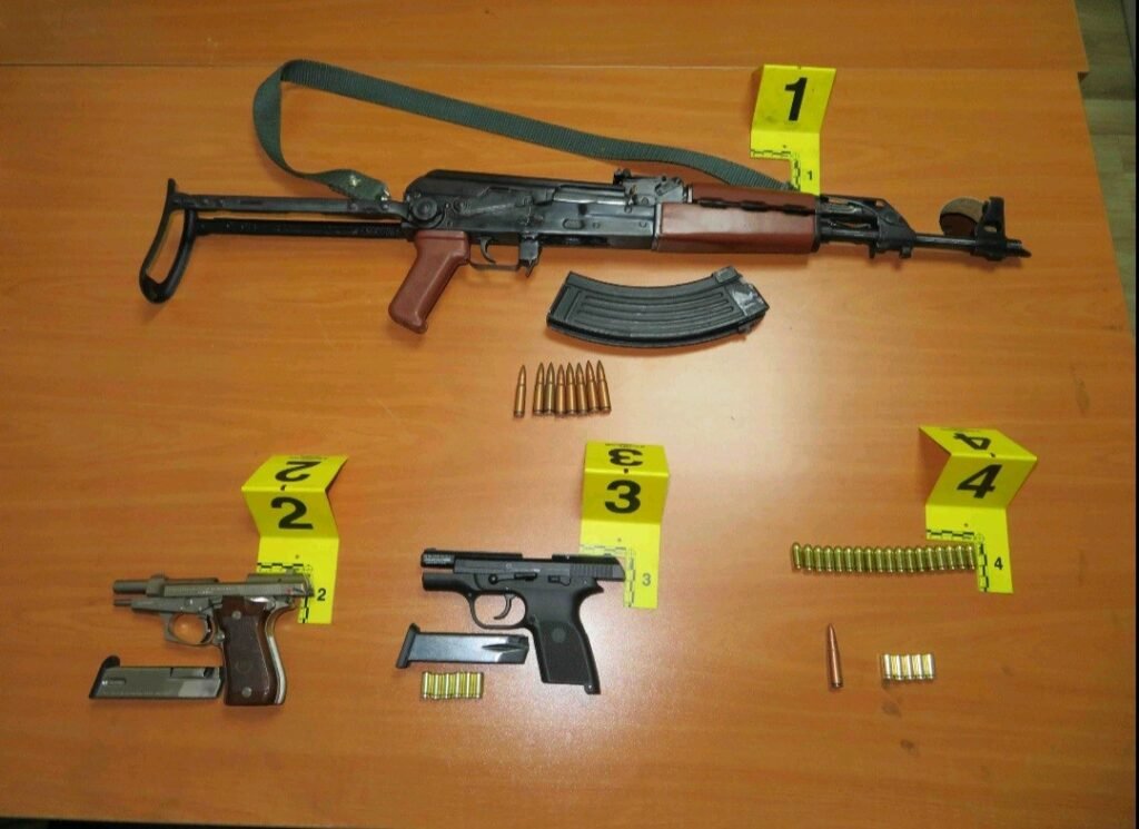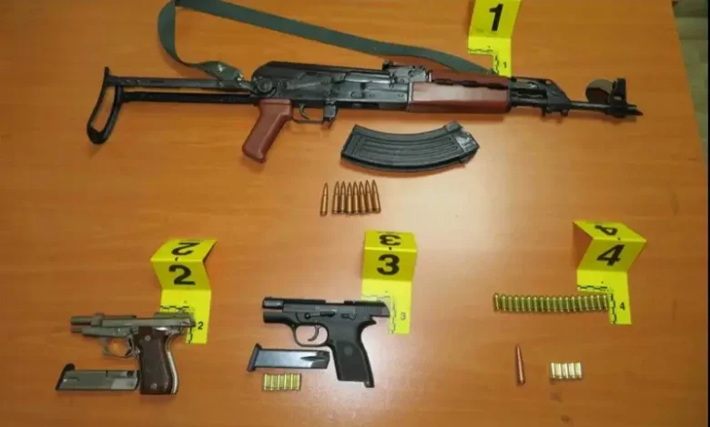 “Gjatë kontrollit të realizuar në veturë janë gjetur dhe sekuestruar armë dhe municion: një armë e gjatë pushkë automatike, dy pistoleta dhe 38 fishekë të kalibrave të ndryshëm”, thuhet në njoftimin e policisë.