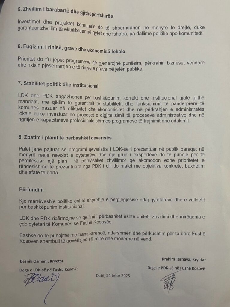 Tashmë është publikuar edhe marrëveshja mes dy partive, e nënshkruar nga Besnik Osmanit (LDK) dhe Rrahim Tërnava (PDK).