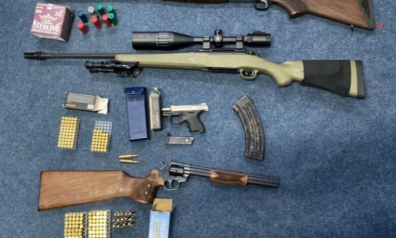 Gjatë kontrollit në shtëpinë e tij, policia konfiskoi dy pistoleta dhe një karikator.