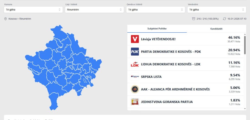Nga fillimi i këtij procesi (e martë, 13 janar 2026, ora 18:00) dhe deri më tani janë rinumëruar 216 nga 914 vendvotime, të cilat u takojnë komunave të ndryshme, si: Deçan (5), Gjakovë (15), Gllogoc (7), Gjilan (13), Dragash (57), Istog (6), Kaçanik (44), Klinë (5), Fushë Kosovë (3) dhe Mitrovicë e Jugut (3),