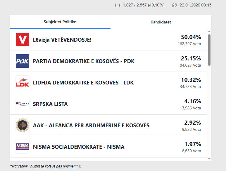 Nga ky rinumërim LVV-ja ka 50.04% të votave, PDK-ja 25.15%, dhe LDK-ja 10.32%.