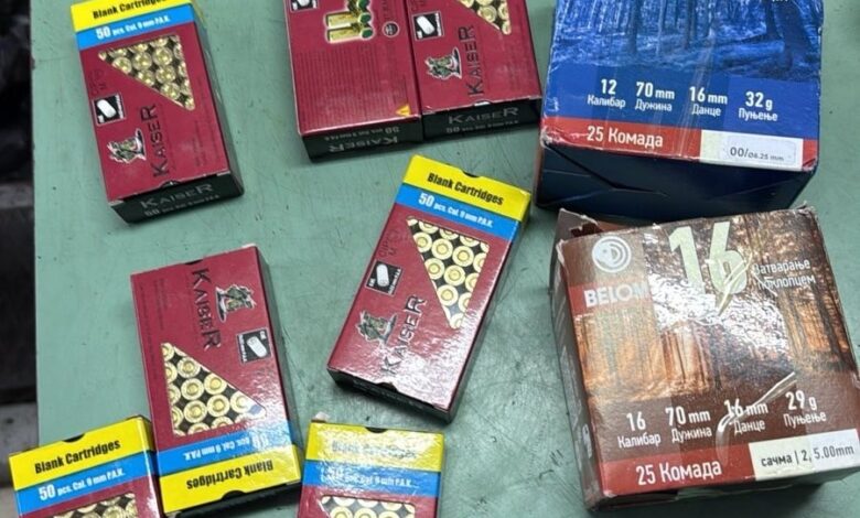 Sipas një njoftimi të Doganës, gjatë kontrollit në lokal dhe në një automjet të ndërlidhur me rastin, janë gjetur dhe sekuestruar gjithsej 350 fishekë 9 mm për armë të shkurtër (pistoletë) dhe 30 fishekë kalibri 70 mm për armë gjuetie, për të cilat dyshohet se janë mbajtur në kundërshtim me legjislacionin në fuqi, transmeton Klankosova.tv.