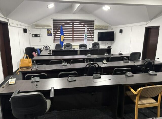 Simbolet dhe flamuri i Kosovës në Kuvendin Komunal të Mitrovicës Veriore ku do të bëhet betimi i kryetarit të ri