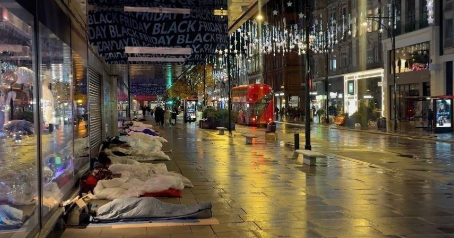 Me rënien e natës në “Oxford Circus” të Londrës, një nga zonat më të shtrenjta të shopingut në botë, rrugët kthehen në vende ku flenë njerëz të pastrehë, duke vënë në pah hendekun gjithnjë e më të madh shoqëror të qytetit.