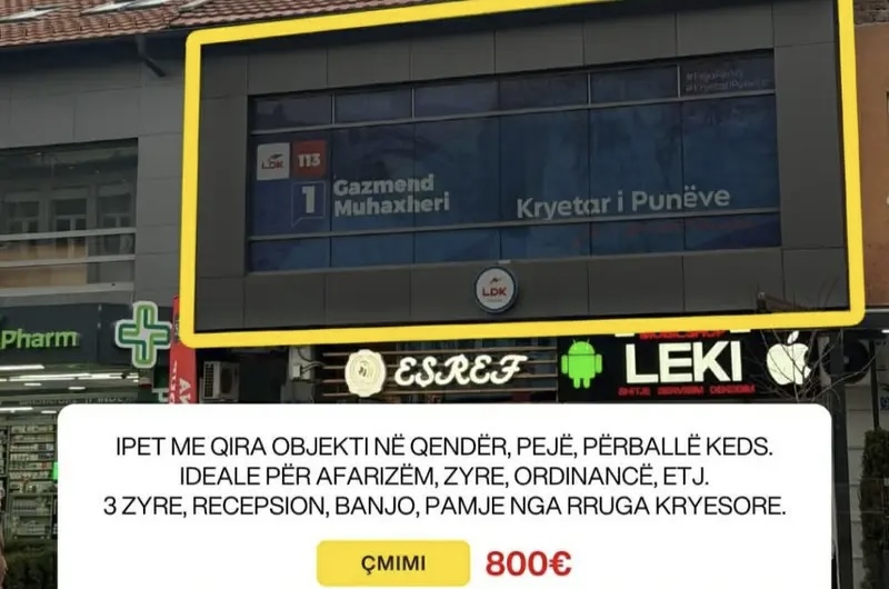 Një faqe e cila merret me patundshmëri e cila quhet “Mega Prona” ka lëshuar një njoftim se objekti aktual ku ndodhet zyra e LDK-së në qytetin e Pejës po ofrohet me qera.